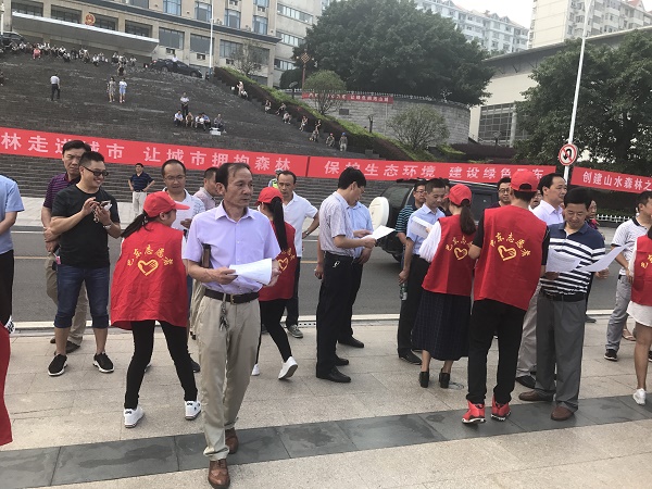 志愿服务团队一行60人由校长廖正贵、校团委书记卢自祥亲自带领。他们早早就来到现场,为广大市民发放传单和宣传资料、讲解森林城市创建活动知识,组织市民填写《调查问卷》。高二五班陈思甜同学作为代表上台宣读了《创建省级森林城市倡议书》。